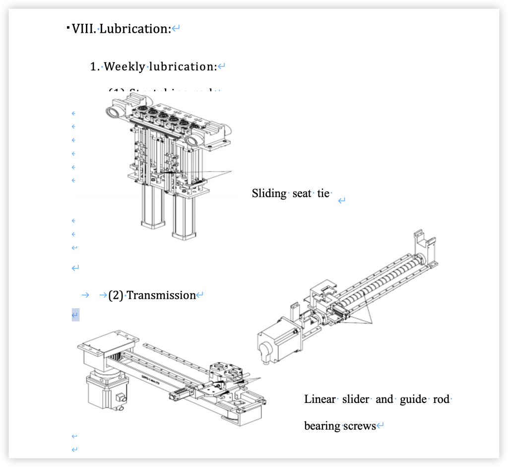 Utilice aire seco filtrado para eliminar el polvo de la máquina de manipulación de materiales y la cinta transportadora, y límpielos con un paño seco. 6. Revise los pernos de soporte de la máquina y mida su planitud. - Mecánica: