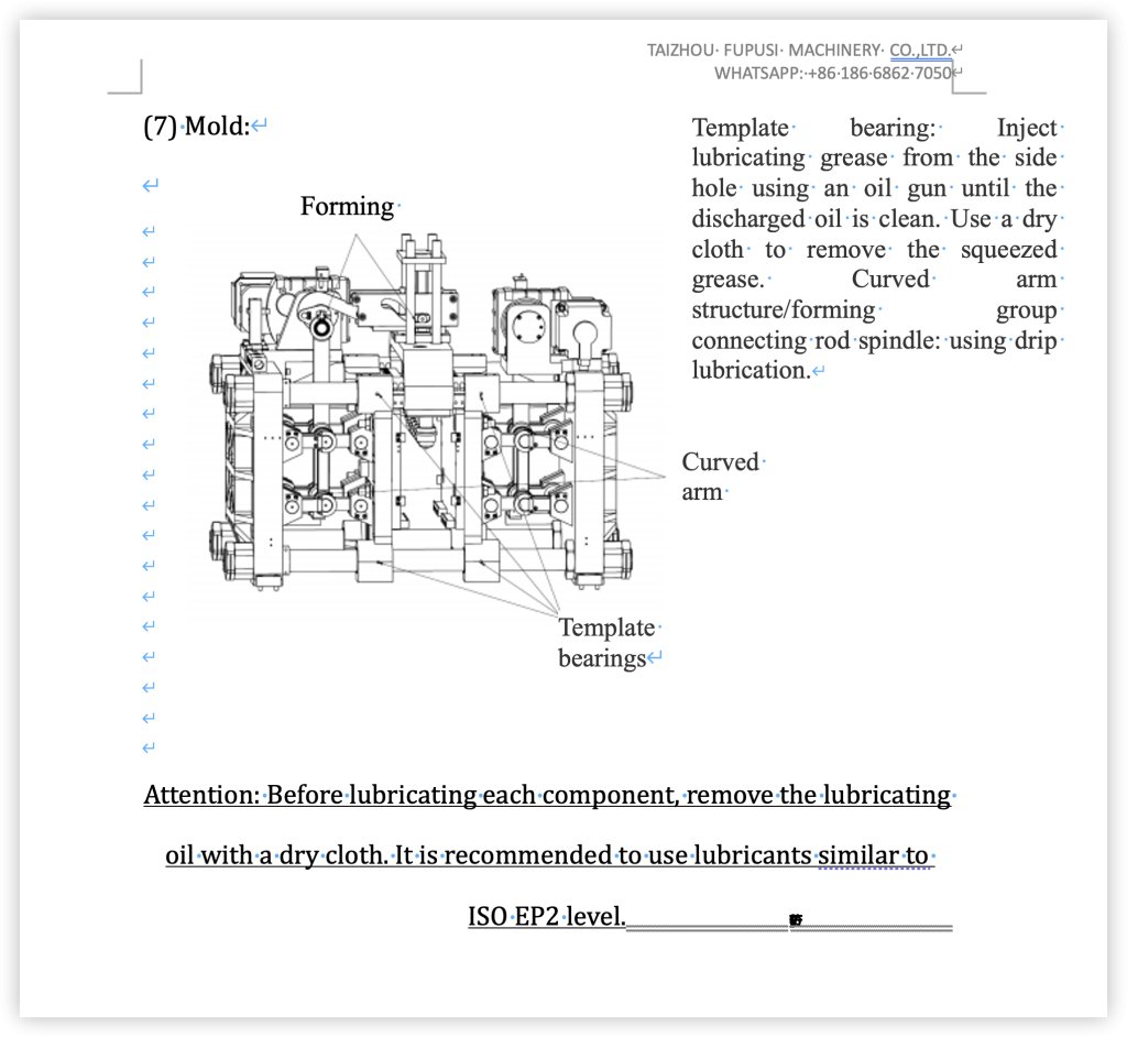 (1) La Administración de Alimentos y Medicamentos de EE. UU. (FDA) debe proporcionar una certificación de calidad para los lubricantes utilizados en maquinaria alimentaria. (2) La parte deslizante del engrasador de la máquina debe lubricarse en la dirección de la flecha.