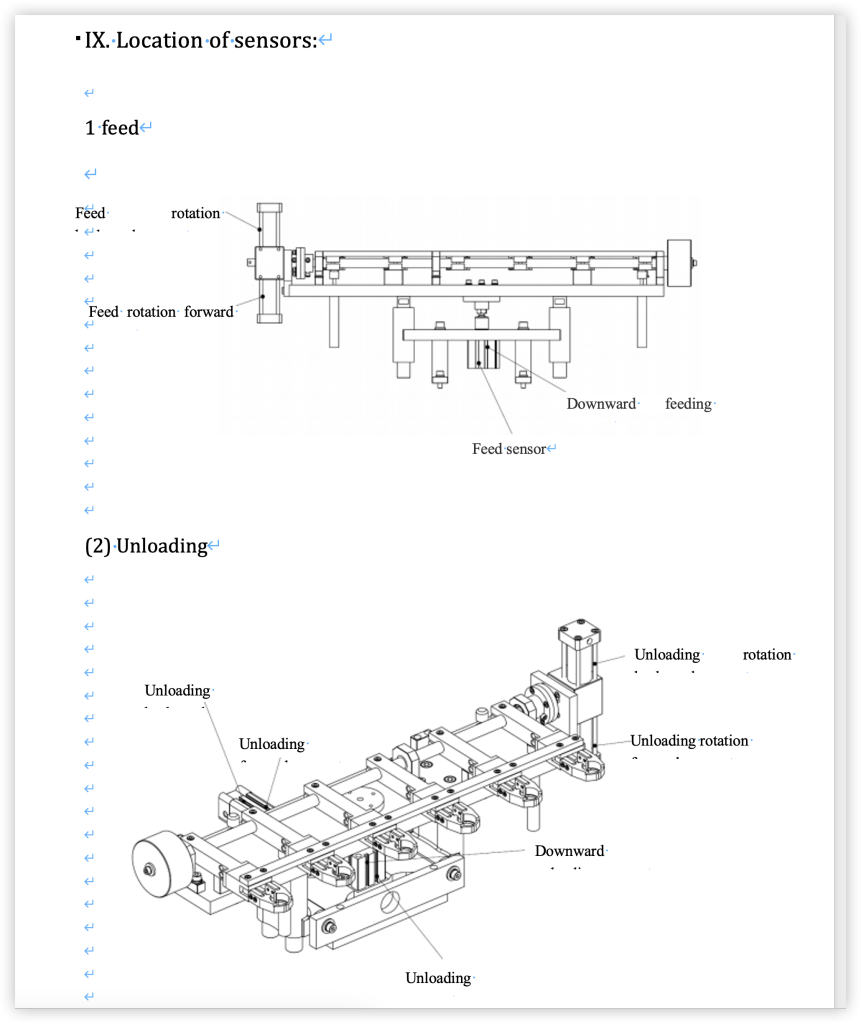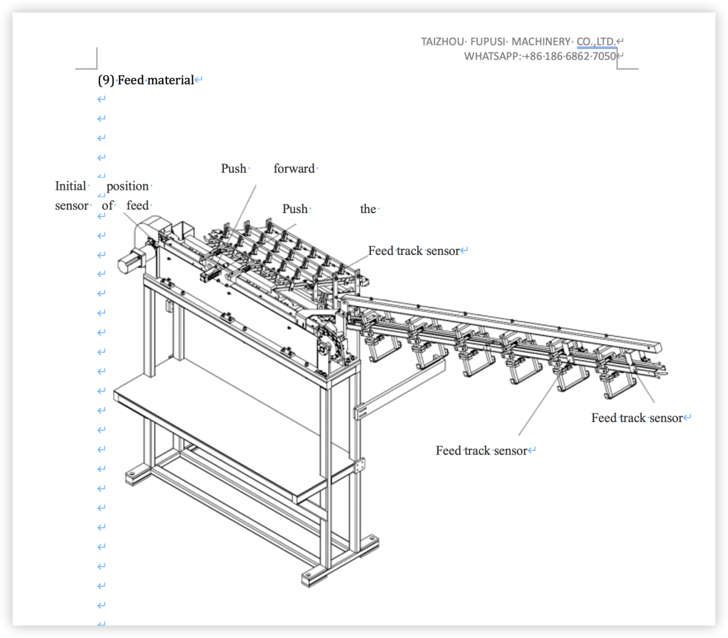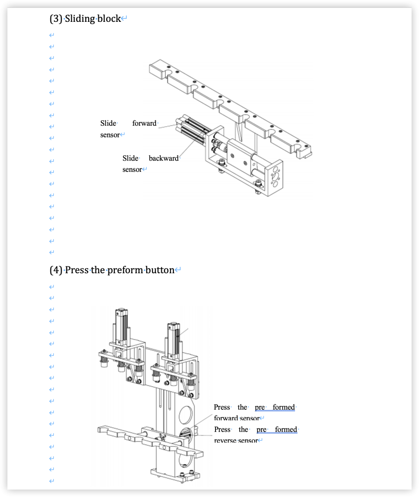 Hay dos conjuntos de sensores fotoeléctricos en la parte central y final de la pista. El sensor fotoeléctrico superior controla el tiempo de alimentación en el transportador. Cuando el sensor fotoeléctrico mide la prealimentación, tras un cierto tiempo, comienza la alimentación. El sensor fotoeléctrico inferior mide el tiempo de alimentación del tocho en la pista. Cuando el sensor fotoeléctrico no responde a la preforma, la cinta transportadora se detiene y el brazo robótico deja de sujetarla, mientras el husillo continúa funcionando.
